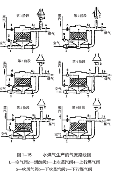 在水煤气制气过程中,为了保证操作安全和充分回收排放气中的可燃成份,所以水煤气的制造过程不是简单的由鼓风和鼓蒸汽两个过程组成一个循环,一般是由5~6个过程组成一个循环。